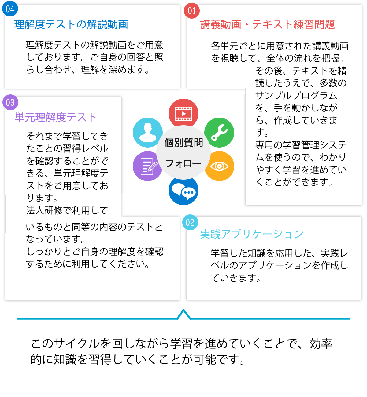 未経験者でもステップバイステップで理解していけるよう、体系的かつ段階的なカリキュラムを用意しています。