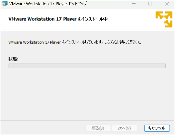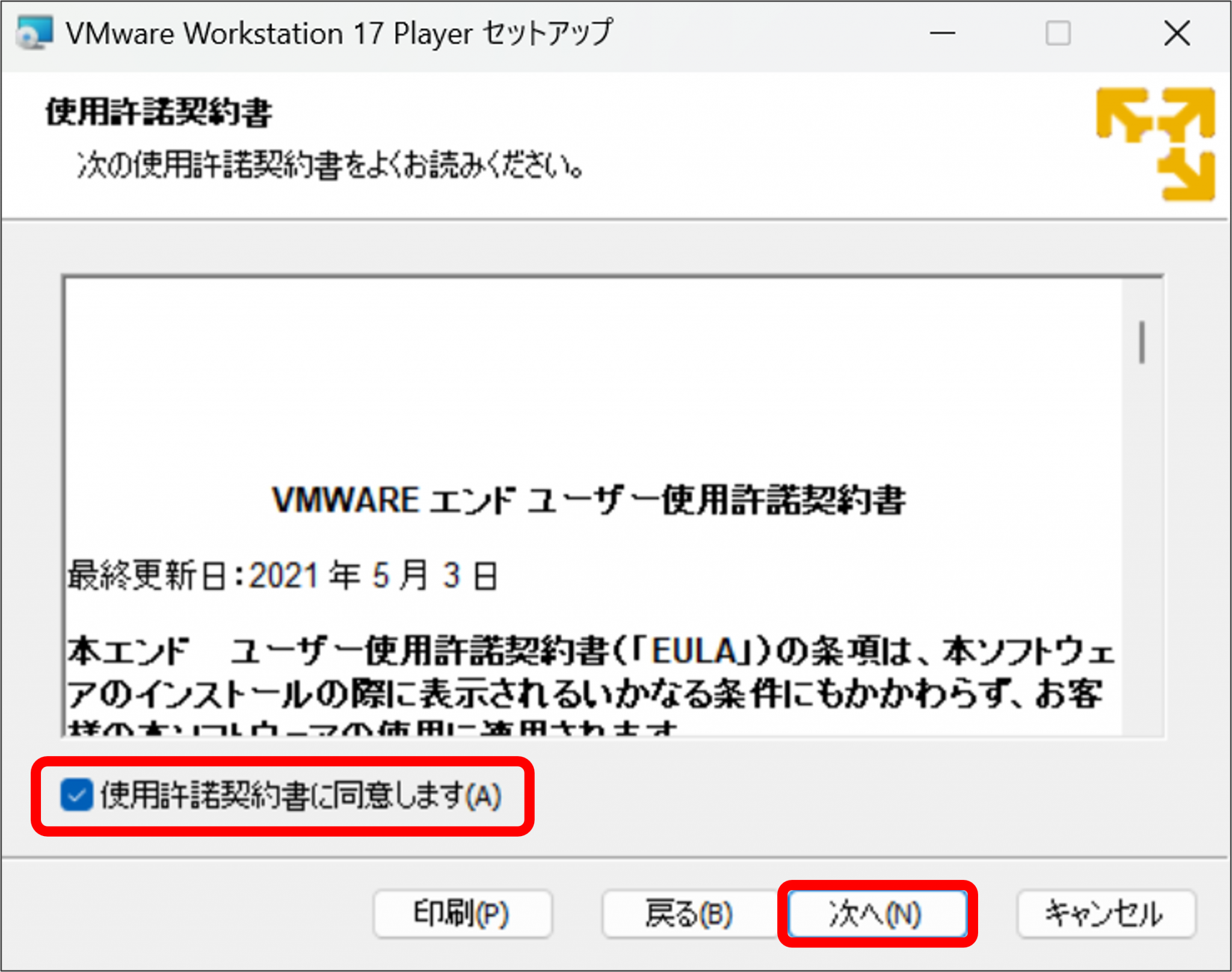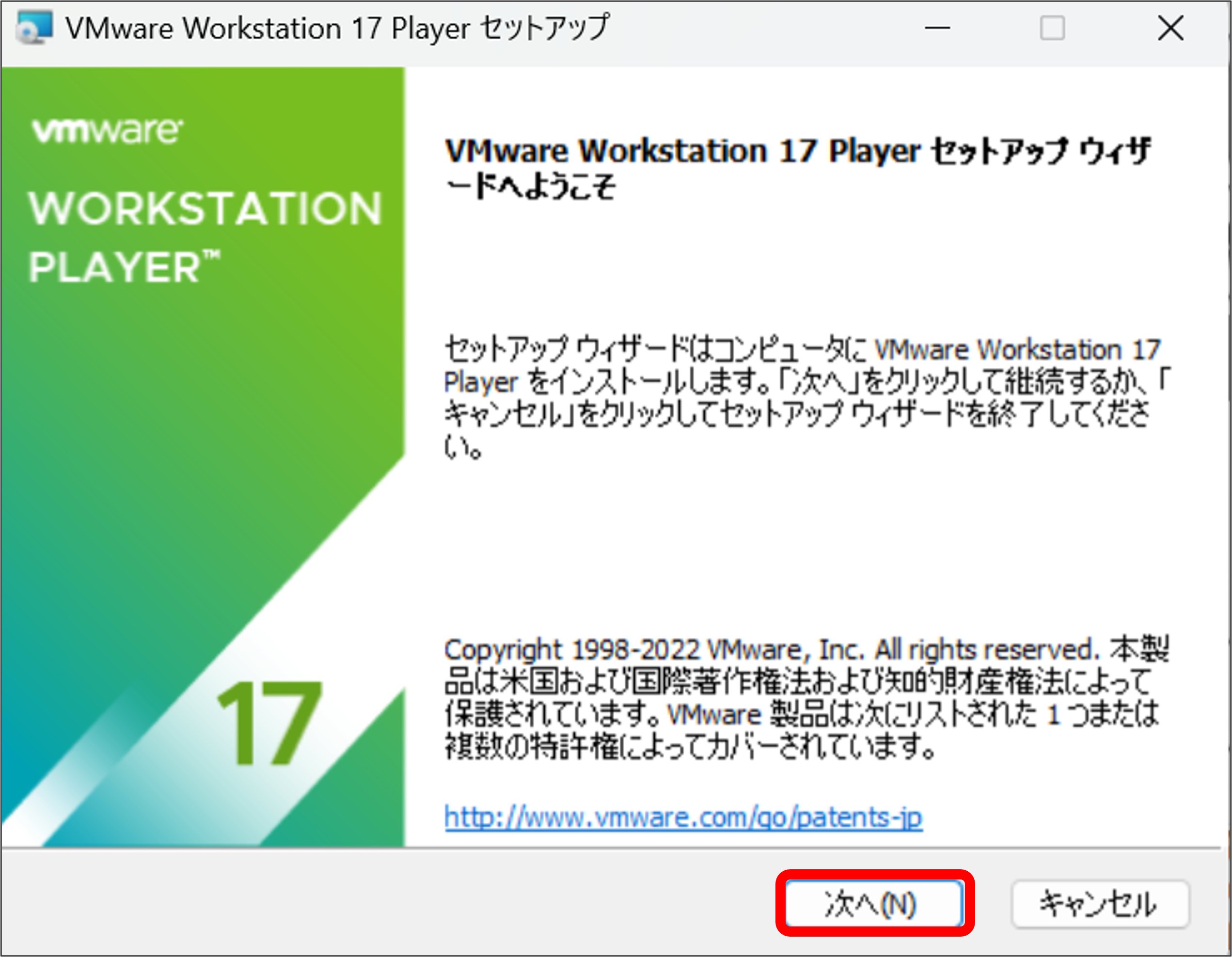 ダウンロードしたファイルを開くと、VMware Workstation Playerのインストーラーが起動します。