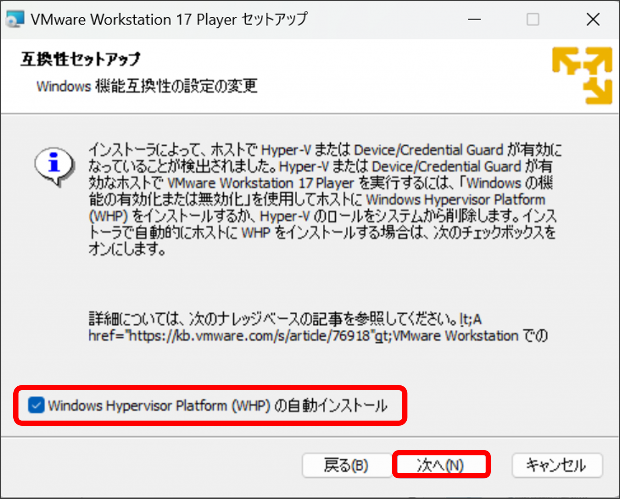 環境によっては上記の「互換性セットアップ」の画面が表示されますので、その場合は、「Windows Hypervisor Platform (WHP)の自動インストール」をチェックした上で、「次へ」ボタンをクリックします。