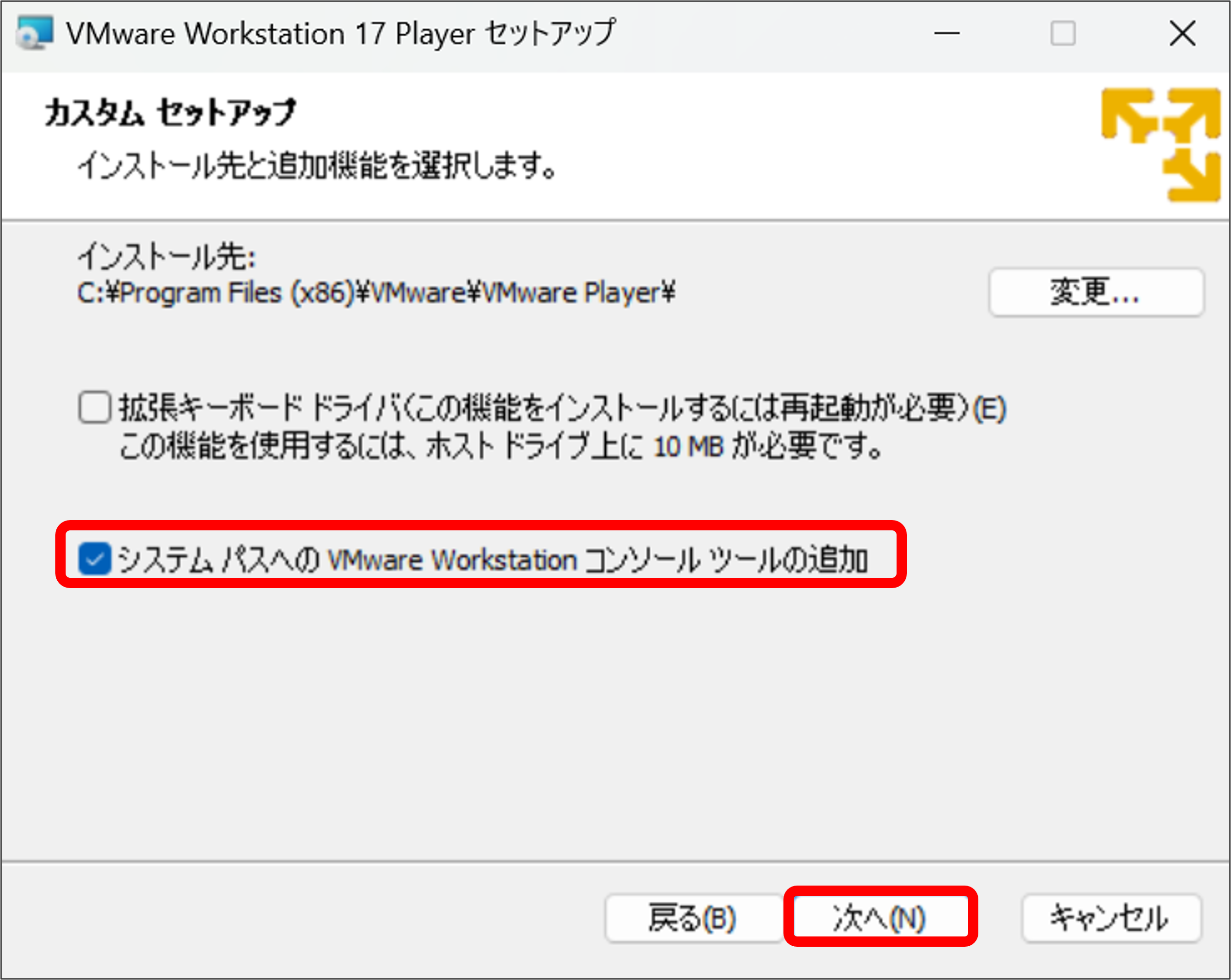 インストール場所を変更しない場合、「システムパスへのVMware Workdstationコンソールツールの追加」にチェックをし