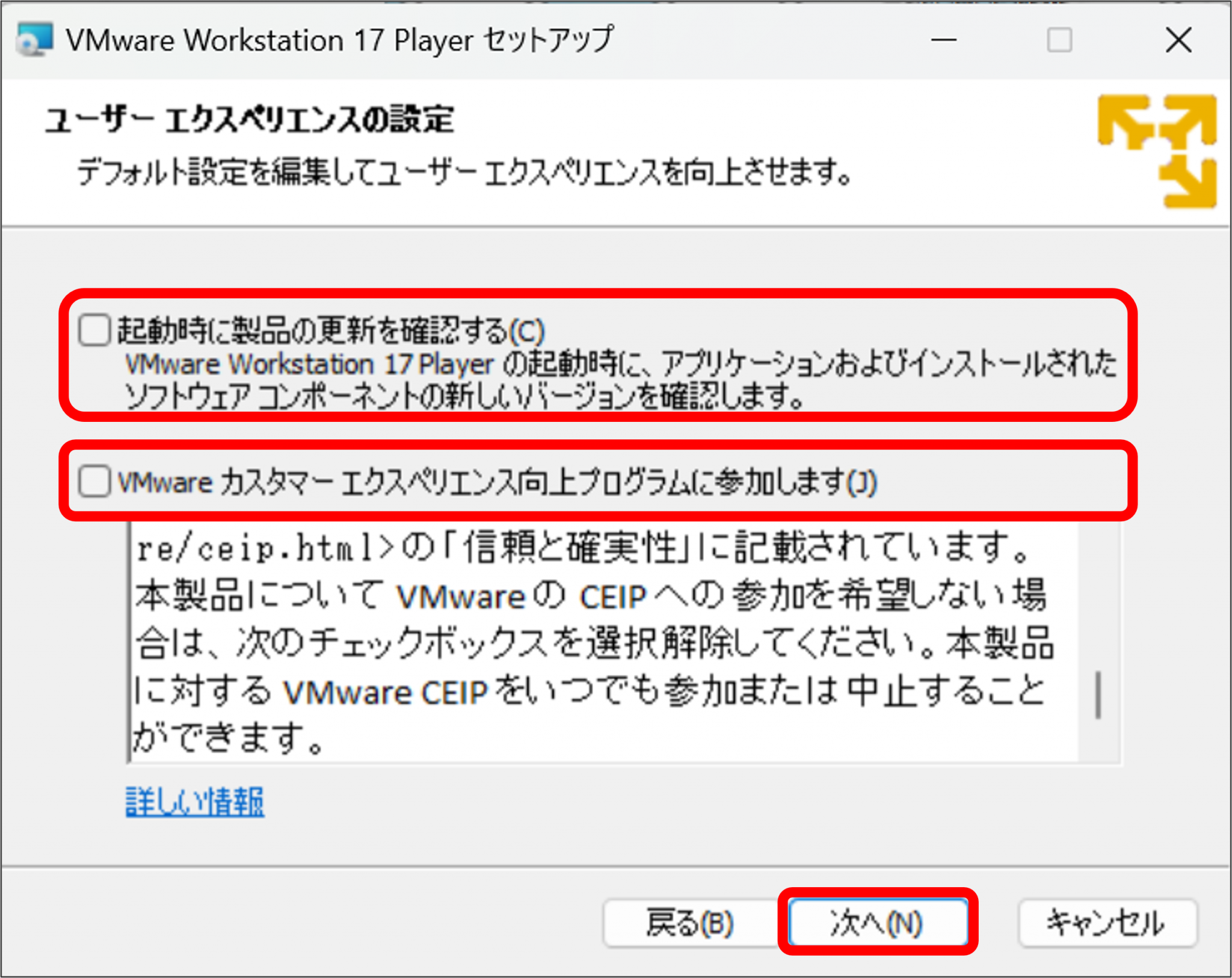 VMwareの使用状況を送信したくない場合はチェックを外し、「次へ」ボタンをクリックします。