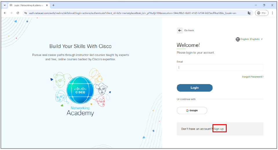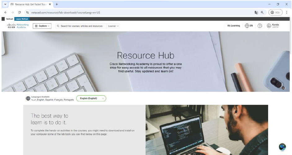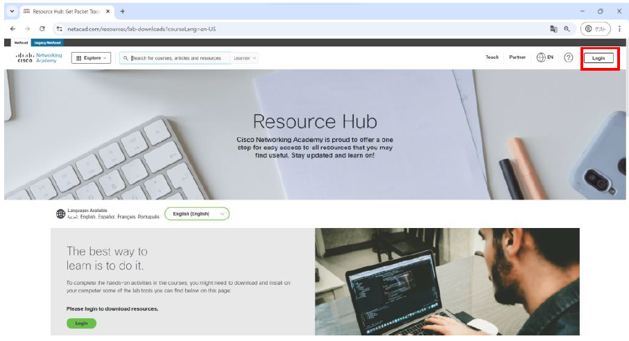 1.Cisco Packet Tracerのダウンロードのため、WebブラウザーでCisco Network Academyにアクセスします。