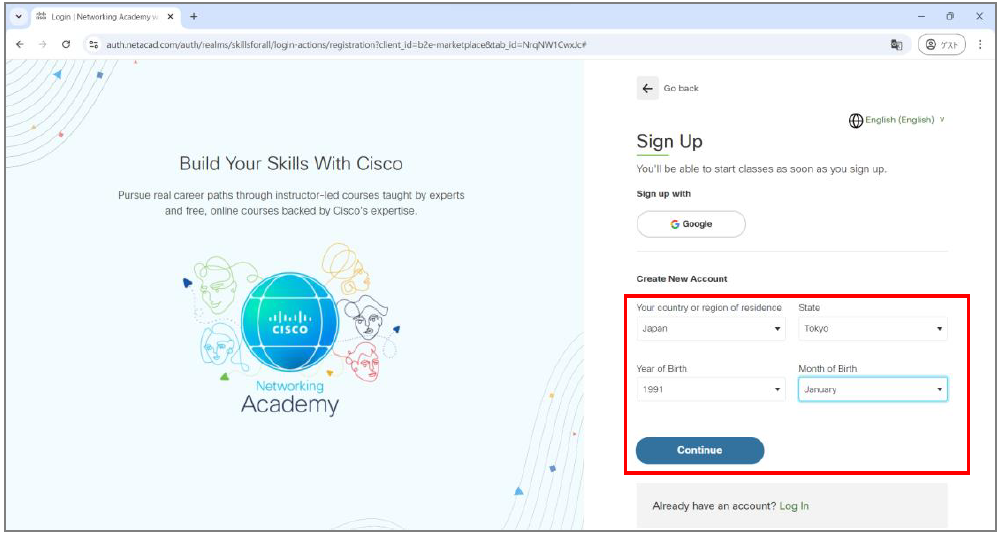 4.Create New Accountの4つのセレクトボックスについて、国、都道府県、生まれた年と月を選択し、「Continue」ボタンをクリックします。
