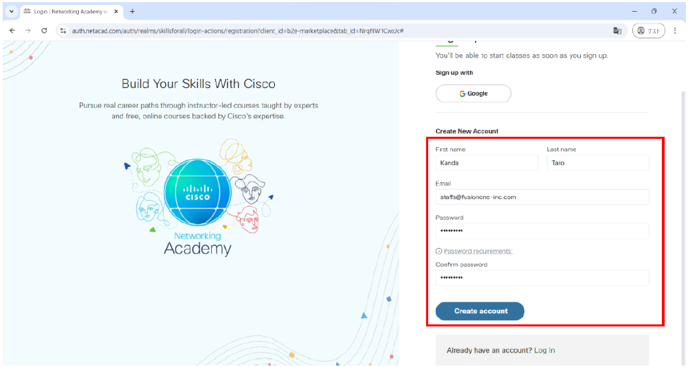 5.次の画面が表示されたら、ご自分の氏名とメールアドレス、任意のパスワードを入力し、「Create account」ボタンをクリックします。