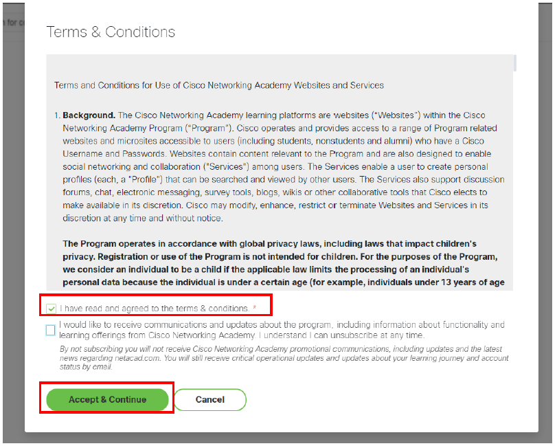 6.次の画面が表示されたら、「I have read and agreed to the terms & conditions. 」のチェックボックスにチェックを付けて「Accept&Continue」ボタンをクリックします。