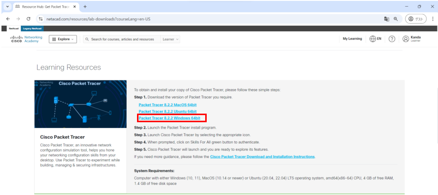 1.ログインしているままで、Cisco Packet Tracerのダウンロードページへ接続します。