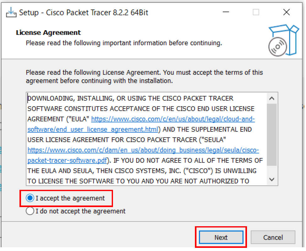 3.セットアップファイル(Windowsの場合はPacket_Tracer822_64bit_setup_signed.exe)をダウンロードし、実行します。以下の画面は「I accept the agreement」を選択し、「Next」をクリックします。