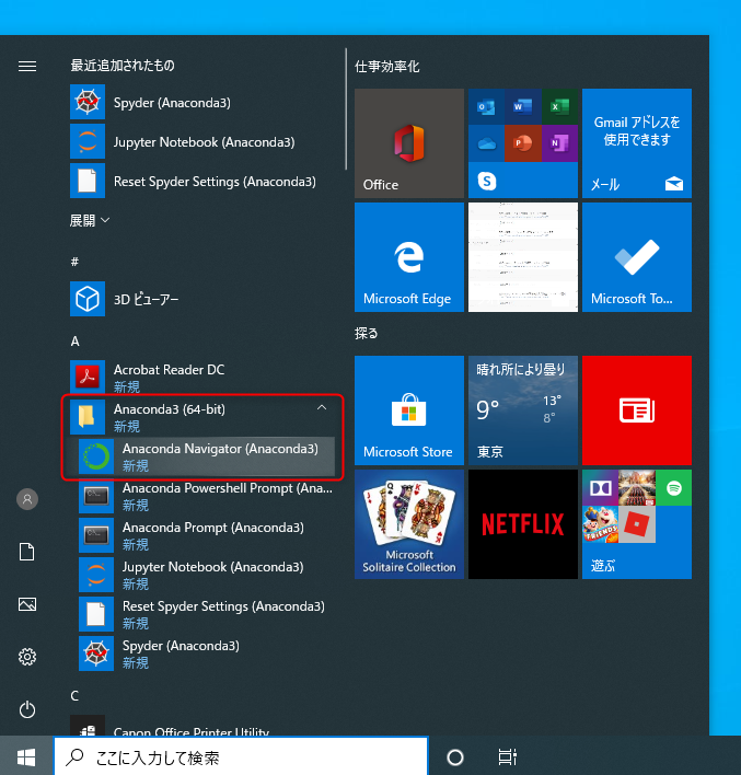 スタートメニューから「Anaconda3(64-bit)」を選択すると、
