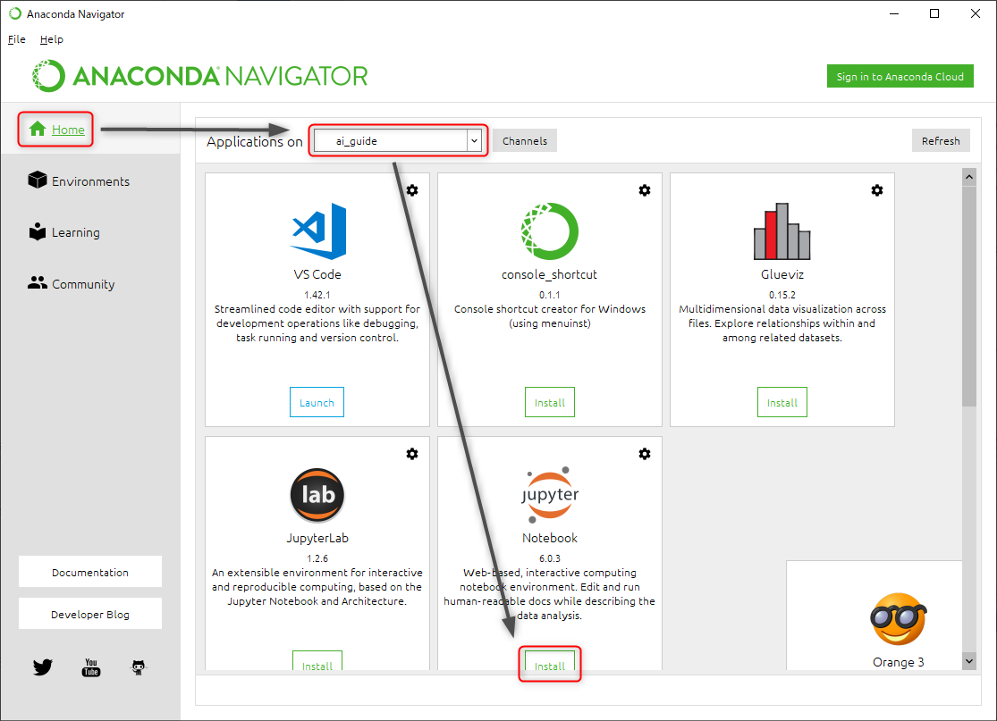 再度「Anaconda Navigator」に戻り、画面左側の「Home」をクリックします。