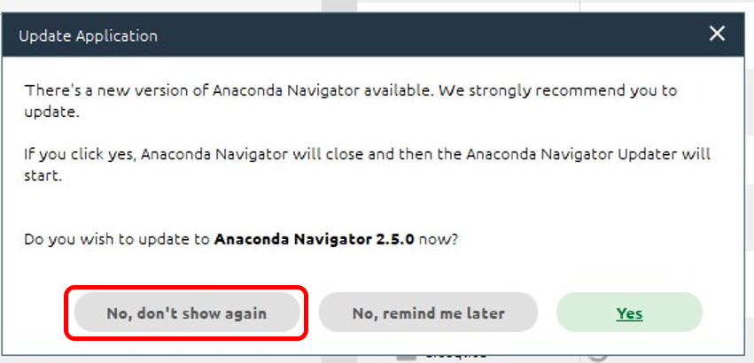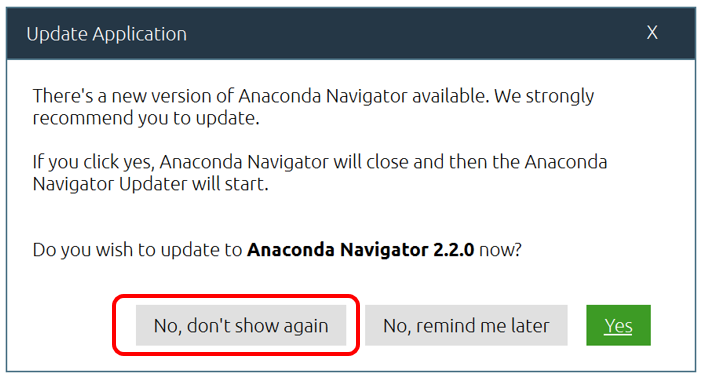 途中「Update Application」の画面が出てきた場合は、「No, don’t show again」をクリックします。