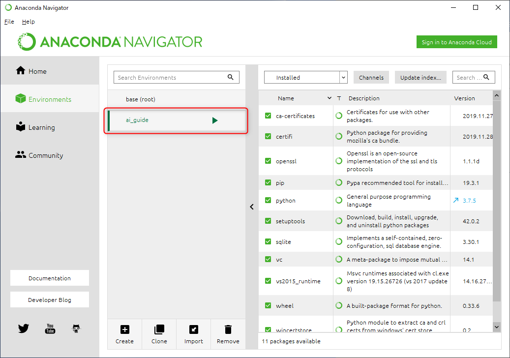 ここでは、AI開発用の仮想環境を「ai_guide」という名前で作成し、その中にインストールしていくことにします。