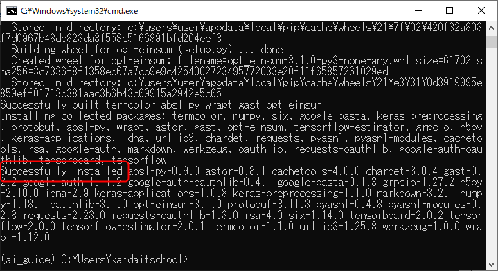 すぐ上に「Successfully installed …」というメッセージが表示されていれば、TensorFlowのインストールは完了です。