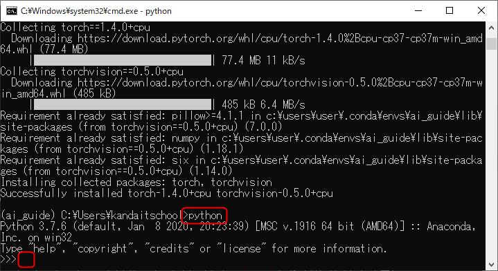 Windowsのコマンドプロンプトが開くので、先頭に「(ai_guide)」と表示されていることを確認します。