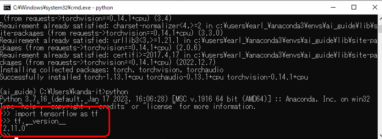 pip install tensorflow==2.11.*」と入力し、キーボードの「Enter」キーを押します。