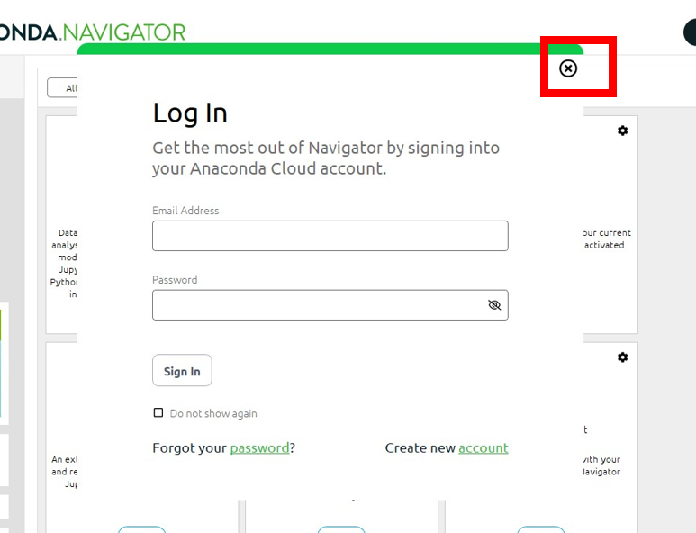 Anaconda Navigatorが起動し、ログイン画面が表示されたら右上の「×」をクリックしログイン画面は閉じます。