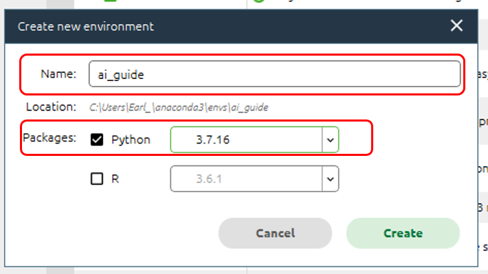 仮想環境の設定画面が開くので、Nameを「ai_guide」に、