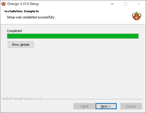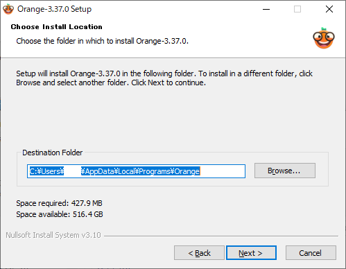 保存先が「C:\Users\ユーザー名\AppData\Local\Programs\Orange」となっていますので、保存先は変えず「Next」ボタンをクリックします。