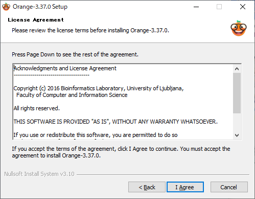 Orange 3の利用規約が表示されるので、同意するために「I Agree」ボタンをクリックします。