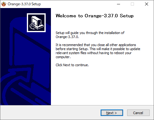 ダウンロードしたファイルを開くと、Orange 3のインストーラーが起動します。