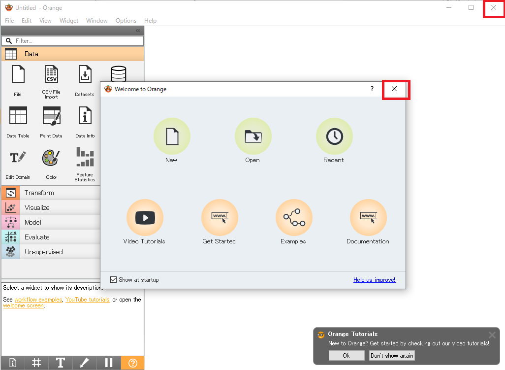 Orange 3」が起動したら「Welcome to Orange」を「×」で閉じ、「Orange3」も「×」で閉じます。
