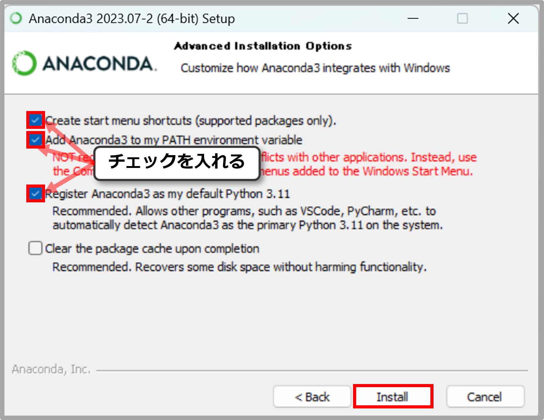 上下の項目の両方にチェックを入れ、「Install」ボタンをクリックします。