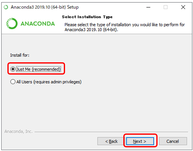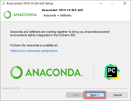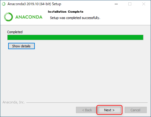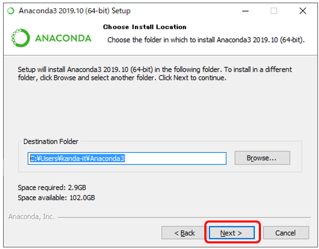 保存先が「C:\Users\ユーザー名\Anaconda3」となっていますので、保存先は変えず「Next」ボタンをクリックします。