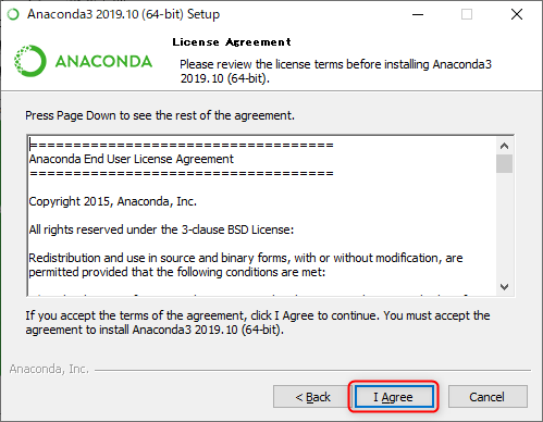 Anacondaの利用規約が表示されるので、同意するために「I Agree」ボタンをクリックします。