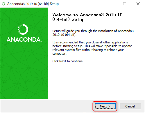 ダウンロードしたファイルを開くと、Anacondaのインストーラーが起動します。