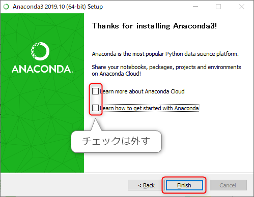 不要なAnaconda公式ページを表示しないように上下の項目の両方からチェックを外し、「Finish」ボタンを押し、インストーラを閉じます。