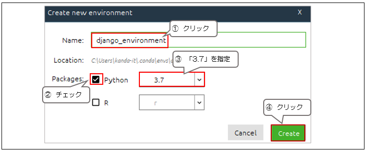 Packagesを「Python 3.7」にして、「Create」ボタンをクリックします。