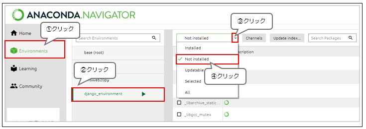 現在、「django_environment」のパッケージ一覧が表示されます。まだインストールしていないパッケージの一覧を表示させるため、下図のように「Not installed」を選択してください。