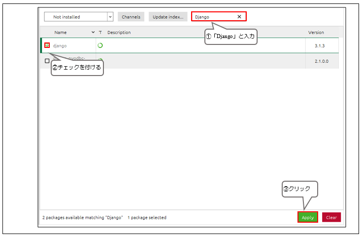右上の検索窓(Search Packages)に「Django」と入力します。「django」というパッケージが表示されるので、チェック☑を付けた上で「Apply」をクリックします。
