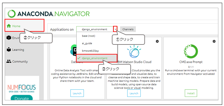 再度「Anaconda Navigator」に戻り、画面左側の「Home」をクリックします。