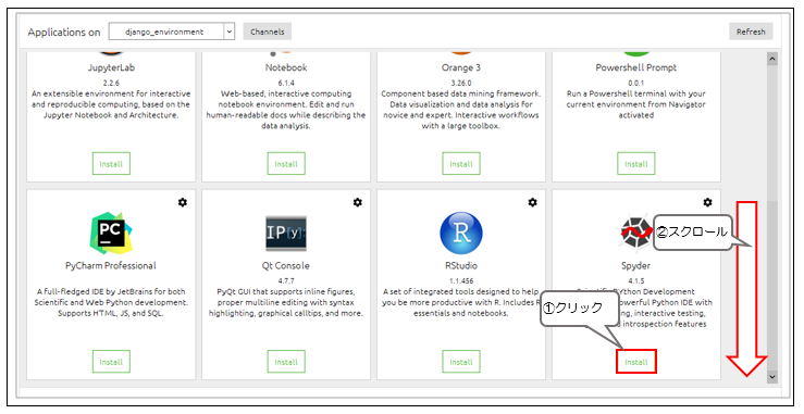 下の方にスクロールして、「Spyder」の「install」ボタンをクリックします。