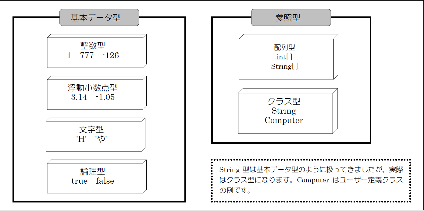Javaプログラミングでは数値や文字が入った変数は「基本データ型」と呼ばれ、配列やオブジェクトの場所情報が入った変数は「参照型」と呼ばれます。簡単にまとめると以下のようになります。