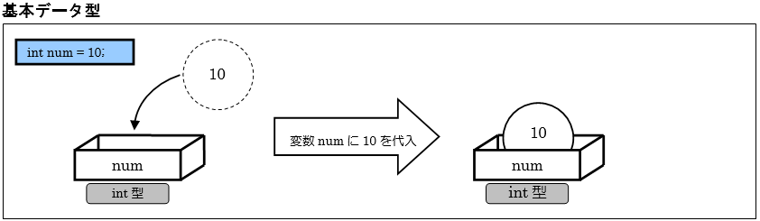 図2.4.2のように「int型変数num」に「数値10」を代入します。そうすると変数numという箱の中にデータが入ったイメージになります。基本データ型はこのような変数(箱)内部の、データを直接やり取りするものになります。では続いて参照型はどのようなイメージになるかクラス型で説明していきます。