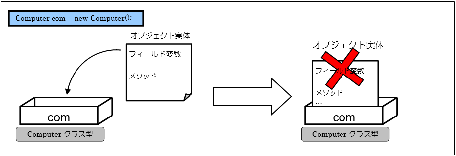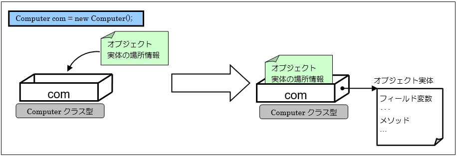 [java] Computer com; com = new Computer(); // または Computer com = new Computer(); [/java]この代入文は右辺においてnew演算子がオブジェクトを生成して、それが左辺の変数comに代入されるように思えますが実際はそうではありません。