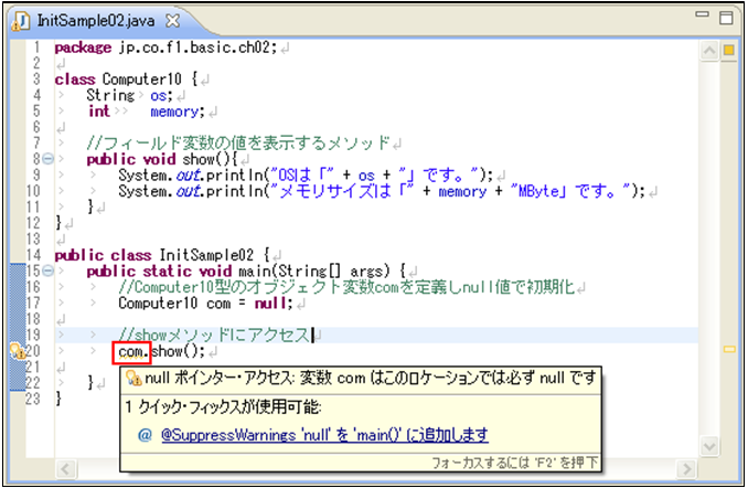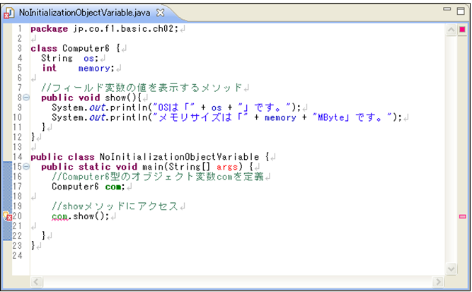 [java] package jp.co.f1.basic.ch02; class Computer6 { String os; int memory; // フィールド変数の値を表示するメソッド public void show() { System.out.println(“OSは「” + os + “」です。”); System.out.println(“メモリサイズは「” + memory + “MByte」です。”); } } public class NoInitializationObjectVariable { public static void main(String[] args) { // Computer6型のオブジェクト変数comを定義 Computer6 com; // showメソッドにアクセス com.show(); } } [/java]① ソース・フォルダー: myproj_basic/src