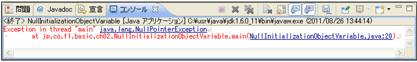 [java] package jp.co.f1.basic.ch02; class Computer7 { String os; int memory; // フィールド変数の値を表示するメソッド public void show() { System.out.println(“OSは「” + os + “」です。”); System.out.println(“メモリサイズは「” + memory + “MByte」です。”); } } public class NullInitializationObjectVariable { public static void main(String[] args) { // Computer7型のオブジェクト変数comを定義しnull値で初期化 Computer7 com = null; // showメソッドにアクセス com.show(); } } [/java]① ソース・フォルダー: myproj_basic/src