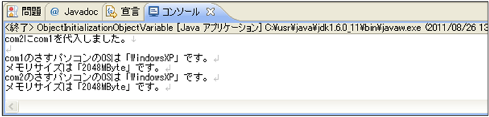 [java] package jp.co.f1.basic.ch02; class Computer8 { String os; int memory; // フィールド変数の値を表示するメソッド public void show() { System.out.println(“OSは「” + os + “」です。”); System.out.println(“メモリサイズは「” + memory + “MByte」です。”); } } public class ObjectInitializationObjectVariable { public static void main(String[] args) { // Computer8型のオブジェクト変数com1を宣言とオブジェクトの生成 Computer8 com1 = new Computer8(); // com1オブジェクトの各値を設定 com1.os = “WindowsXP”; com1.memory = 2048; // Computer8型のオブジェクト変数com2を宣言と同時に別変数で初期化 Computer8 com2 = com1; System.out.println(“com2にcom1を代入しました。\n”); // com1のshowメソッドにアクセス System.out.print(“com1のさすパソコンの”); com1.show(); // com2のshowメソッドにアクセス System.out.print(“com2のさすパソコンの”); com2.show(); } } [/java] 実行結果① ソース・フォルダー: myproj_basic/src