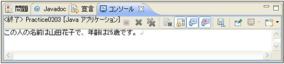 [java] public void showPerson(){ String name = “山田花子”; int age = 25; System.out.println(“この人の名前は” + name + “で、年齢は” + age + “歳です。”); } [/java]