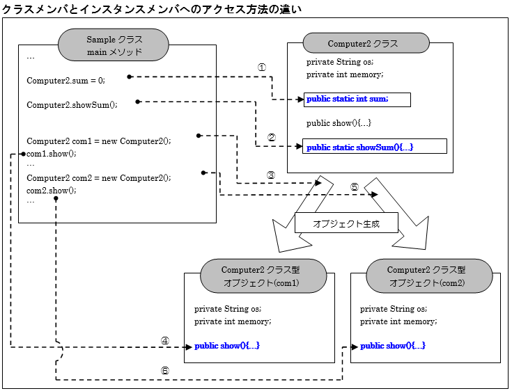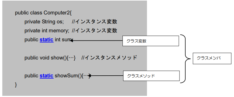 3~27行目で定義されているComputer2クラスはインスタンスメンバとクラスメンバで構成されています。6行目のフィールド変数「sum」がクラス変数に該当し、24行~26行目のメソッド「showSum()」がクラスメソッドに該当します。その他のフィールド変数やメソッドはインスタンスメンバになります。