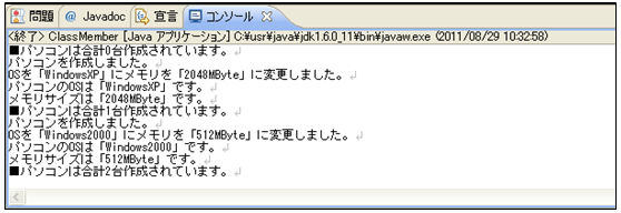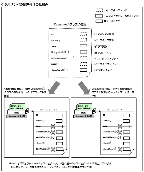 [java] package jp.co.f1.basic.ch06; class Computer2 { private String os; // インスタンス変数 private int memory; // インスタンス変数 public static int sum; // クラス変数 // コンストラクタ public Computer2() { this.os = null; this.memory = 0; sum++; System.out.println(“パソコンを作成しました。”); } public void setOsMemory(String os, int memory) { // インスタンスメソッド this.os = os; this.memory = memory; System.out.println(“OSを「” + os + “」にメモリを「” + memory + “MByte」に変更しました。”); } public void show() { // インスタンスメソッド System.out.println(“パソコンのOSは「” + os + “」です。”); System.out.println(“メモリサイズは「” + memory + “MByte」です。”); } public static void showSum() { // クラスメソッド System.out.println(“■パソコンは合計” + sum + “台作成されています。”); } } public class ClassMember { public static void main(String[] args) { Computer2.sum = 0; // クラス変数sumにアクセスし0で初期化 Computer2.showSum(); // クラスメソッドshowSumにアクセス1回目(オブジェクト作成前) Computer2 com1 = new Computer2(); com1.setOsMemory(“WindowsXP”, 2048); com1.show(); Computer2.showSum(); // クラスメソッドshowSumにアクセス2回目(com1オブジェクト作成後) Computer2 com2 = new Computer2(); com2.setOsMemory(“Windows2000”, 512); com2.show(); Computer2.showSum(); // クラスメソッドshowSumにアクセス3回目(com1,com2オブジェクト作成後) } } [/java] 実行結果① ソース・フォルダー: myproj_basic/src