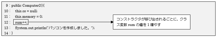 Computer2クラスのコンストラクタ処理内12行目で、クラス変数「sum」をインクリメントしています。