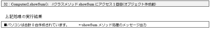 [java] Computer2.sum = 0; //クラス変数sumにアクセスし0で初期化 [/java]続いて32行目の処理でクラスメソッドである「showSum()メソッド」にアクセス(1回目)し、クラス変数の「sum」の値を画面に出力しています。実行結果からも分かるように31行目で設定した値0で正しくメッセージが出力されているのが確認できます。