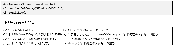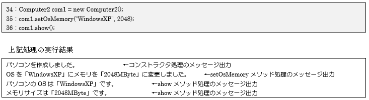 34行目で1つ目のComputer2型のオブジェクトを生成し、「setOsMemory()メソッド」を利用して値を設定しています。値が正しく設定されているかを「show()メソッド」を利用して確認しています。