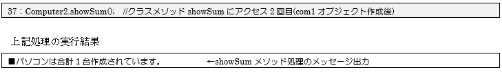 34行でComputer2型のオブジェクト生成が行われクラス変数「sum」の値が1増えているはずなので、37行目でクラスメソッドである「showSum()メソッド」にアクセス(2回目)し、クラス変数の「sum」の値を画面に出力しています。オブジェクト生成後クラス変数「sum」の値は正しく1増えていることが確認できます。