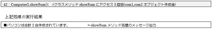 39行でComputer2型のオブジェクト生成が行われクラス変数「sum」の値がさらに1増えているはずなので、42行目でクラスメソッドである「showSum()メソッド」にアクセス(3回目)し、クラス変数の「sum」の値を画面に出力しています。オブジェクト生成後クラス変数「sum」の値が、1増えていることが確認できます。