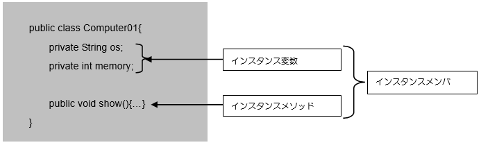 4、5行目の2つのフィールド変数「os、memory」がインスタンス変数に該当し、13行~21行目の2つのメソッド「setOsMemory()、show()」がインスタンスメソッドに該当します。