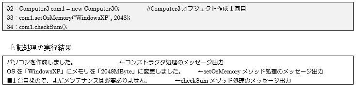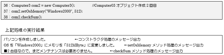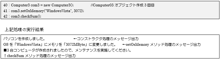 最後となる3回目のオブジェクト作成を40行目で行います。41行目でメソッドを利用して各値を設定したのち、42行目の「checkSumメソッド」を呼び出してクラス変数の値チェックを行っています。今回のオブジェクト生成処理でsumの値が3となり、画面に「■3台コンピュータが作成されましたので、メンテナンスを実施してください。」と正しく出力されているのが確認できます。